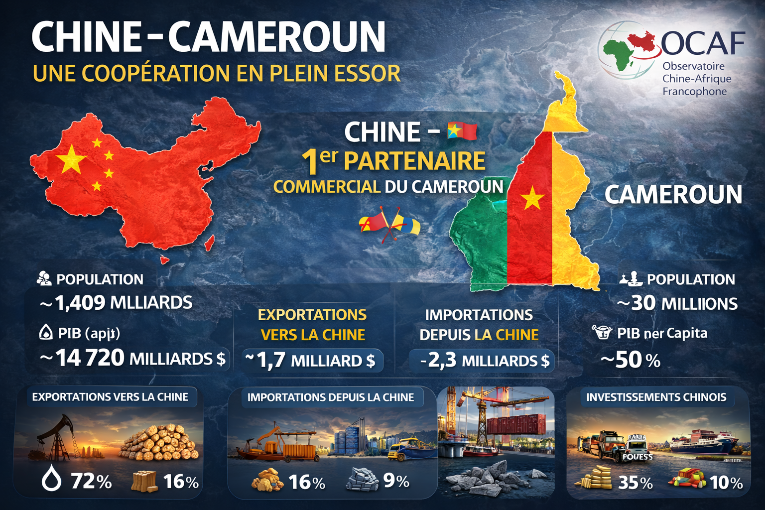 Le partenariat Chine–Cameroun n’est plus, depuis longtemps, une simple relation diplomatique de convenance. Il est devenu l’un des axes les plus structurants de l’insertion internationale du Cameroun, à la fois par le volume des échanges, par le poids des financements chinois dans les infrastructures, par la place de Pékin dans la dette bilatérale camerounaise et par la capacité de la Chine à se rendre visible dans des projets à forte portée symbolique et économique. Les relations diplomatiques ont été établies le 26 mars 1971, après la rupture des liens entre Yaoundé et Taïwan. Depuis lors, la relation a connu une montée en densité politique continue. Le tournant le plus important de la période récente est intervenu le 4 septembre 2024, lorsque Xi Jinping et Paul Biya ont annoncé l’élévation des relations sino-camerounaises au rang de partenariat stratégique global. Ce relèvement n’est pas seulement protocolaire : il signale que le Cameroun est perçu à Pékin comme un partenaire d’ancrage en Afrique centrale, au croisement du golfe de Guinée, des corridors régionaux et des dynamiques de la CEEAC et de la CEMAC.