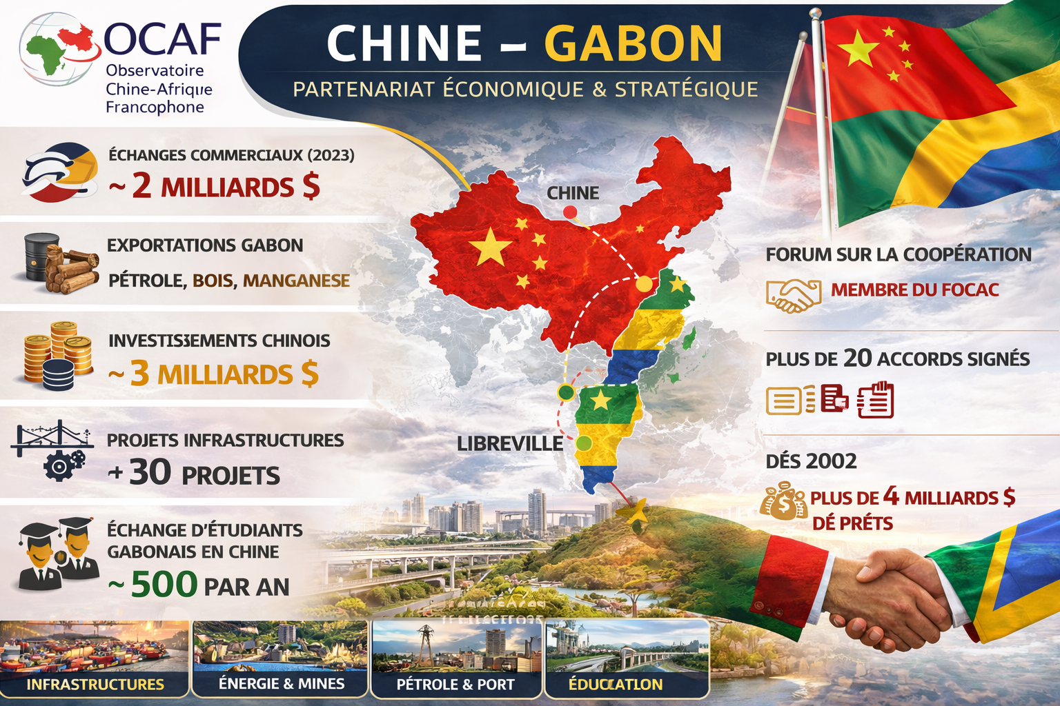 La relation Chine–Gabon est aujourd’hui l’une des plus stables et des plus politiquement structurées d’Afrique centrale. Les deux pays ont établi leurs relations diplomatiques le 20 avril 1974, et ce lien a franchi un seuil qualitatif en avril 2023, lorsque Pékin et Libreville ont décidé d’élever leur relation au rang de partenariat stratégique global de coopération. Cette décision n’était pas simplement cérémonielle. Elle signifiait que le Gabon cessait d’être, aux yeux de la Chine, un partenaire sectoriel centré sur les matières premières, pour devenir un partenaire stratégique au croisement de plusieurs agendas : énergie, mines, forêt, climat, infrastructures, sécurité, et diplomatie multilatérale. La déclaration conjointe de 2023 est très claire : les deux parties y annoncent un approfondissement de la coopération dans les routes, l’électricité, les télécommunications, l’agriculture, le pétrole et le gaz, les mines, la forêt, la pêche, ainsi qu’un alignement entre l’Initiative “la Ceinture et la Route” et les stratégies gabonaises de transformation.