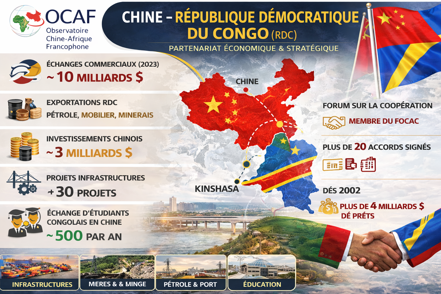 La relation entre la Chine et la République démocratique du Congo n’est plus une simple relation bilatérale parmi d’autres dans l’espace sino-africain. Elle est devenue l’un des nœuds centraux de l’économie politique mondiale des minerais critiques, des chaînes de valeur industrielles et de la transition énergétique. Pékin et Kinshasa ont élevé leur relation au rang de partenariat stratégique global en 2023, après un premier palier de partenariat stratégique gagnant-gagnant en 2015. Depuis, les échanges de haut niveau se sont intensifiés : Félix Tshisekedi a effectué une visite d’État en Chine en mai 2023 puis est revenu à Pékin pour le Sommet du FOCAC en septembre 2024 ; en retour, la Chine a dépêché en janvier 2024 un envoyé spécial à la cérémonie d’investiture du président congolais. Cette densification politique s’inscrit aussi dans des mécanismes plus structurés : commission mixte économique et technique depuis 1984, accord bilatéral de protection des investissements depuis 2011, mémorandum sur l’Initiative la Ceinture et la Route depuis 2021. Ce n’est donc pas un partenariat conjoncturel. C’est un partenariat installé dans les appareils diplomatiques, économiques et stratégiques des deux États.